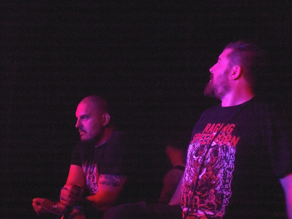 Raging Speedhorn may be purveyors of gnarly sludge metal, but they’re certainly not uncivilised: drummer Gordon Morrison pours beer from bottles into (perspex) glasses before they play. After an inter-band playlist that featured, amongst others, Fudge Tunnel, they walk on to ‘The Heat is On’ by Glen Frey, and yes, the compact basement venue is fucking boiling. With the stage drenched in feedback, vocalists John Loughlin and Frank Regan stand, silent, at the front of the stage, simply leaning out toward the crowd, looking menacing, they hold it for a full minute. This is showmanship, and it’s the band’s commitment to the performance element of the show is integral to the live experience. That said, they’re not posers, by any means: in fact, they’re just a bunch of middle-aged guys with beards and tattoos, wearing vests / T-shirts and long shorts, but they give one hundred percent to the music, and the aggression, the brute force with which the songs are played is so genuine it’s scary. Their contrasting styles work well: Loughlin screams maniacally and looks deranged as he charges he stage, while Regan is almost nonchalant and looks like he’s relishing goading the crowd with ‘come on’ hand gestures before he spits and snarls into the mic.