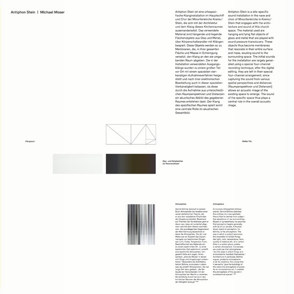 Returning to a brace of recurrent themes, including that of process as touched on in my write-up of Laurent Perrier’s latest collection of ‘one-way collaborations’, process and place are again key factors in the making of Michael Moser’s sprawling double album, Antiphon Stein. The majority of the sound featured on the album derives from Klaus Lang playing organs in various churches – although the sounds here are very different from those featured on Stefan Fraunberger’s recent album.