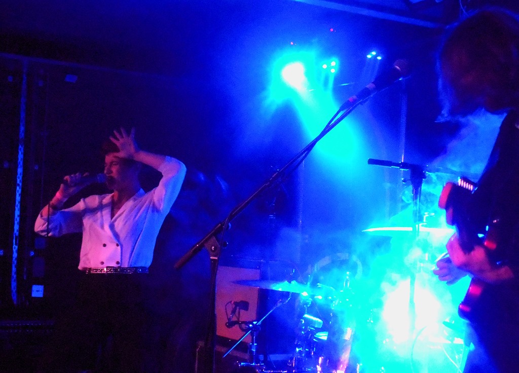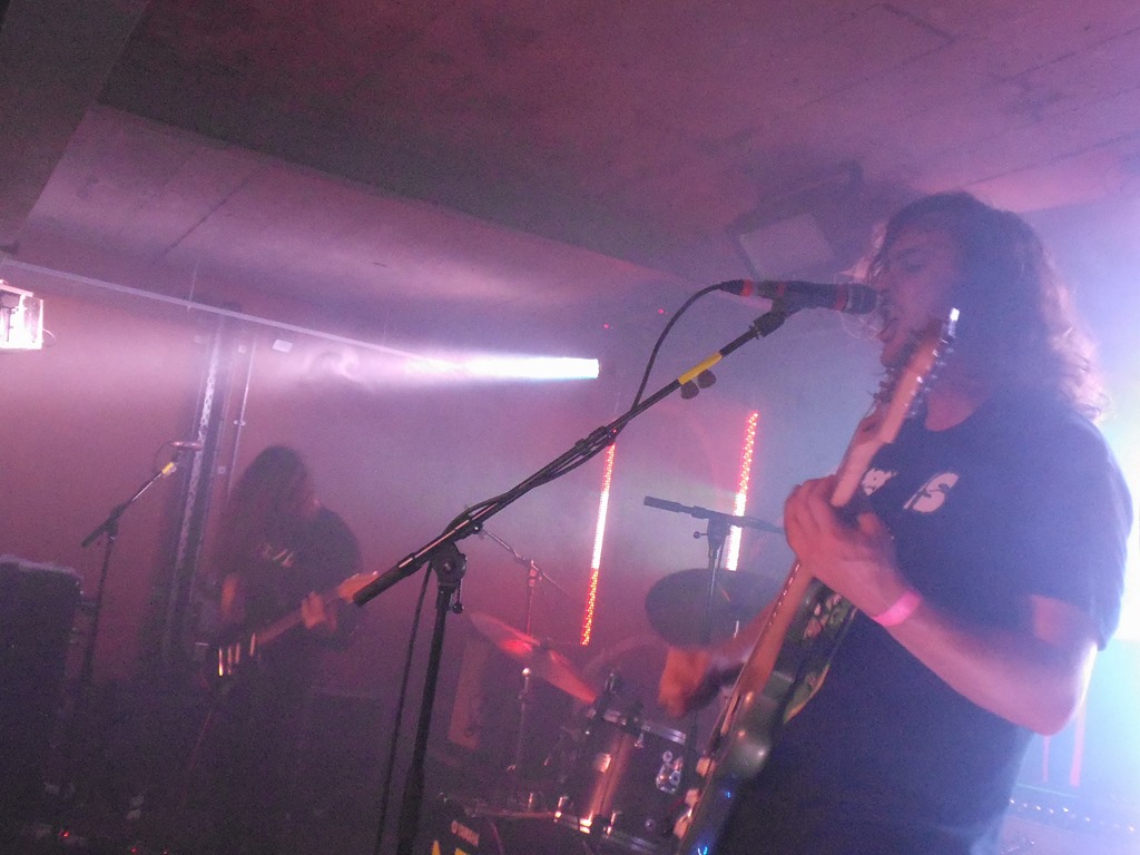 Those who turned up in reasonable time got a real treat in the form of opening support act Dead Naked Hippies, who caught my attention a few months ago with the release of ‘Drain You’ on a split 12”.  The Leeds art-rock trio, consisting of drums / guitar / vocal kick some serious arse. The guitar sound is dirty, a little bit messy, but works well in contrast with the crisp drum work. It’s Lucy Jowett who really commands the attention, though, lunging and stomping about the stage, wide-eyed and crackling with tension. They’re already going places, and were worth the entry fee alone.