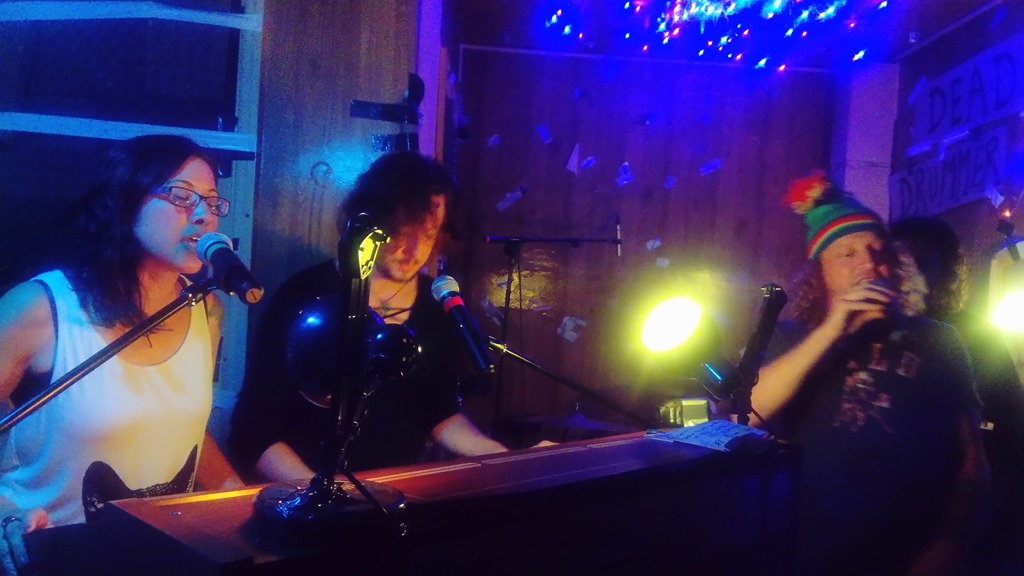 And so I find myself in a room I’d previously sat in as a studio-in-progress, repurposed as a sort of rehearsal space with lights, before some kind of weird Japanese-made electronic organ / synth contraption from the early 80s. A dude in a cropped jumper and sporting a neatly-trimmed beard bounds about flamboyantly and chats entertainingly between songs played by the trio on said instrument. He’s accompanied by and shares vocal duties with a curly-topped chap in a bobble hat and a super-bouncy female singer / keyboardist in glasses. They sings off-kilter songs with pithy lyrics and groovesome rhythms and a certain retro vibe, which build a sort of narrative across the set. Welcome to the world of Drooligan. I haven’t quite made up my mind yet, but tonight they delivered something special, something engaging, something different. And something different is rare, which makes this quite the compliment.