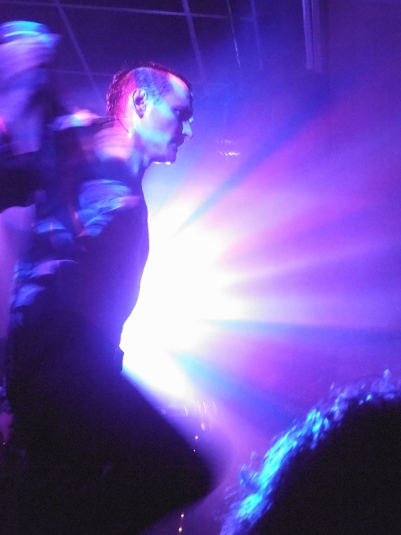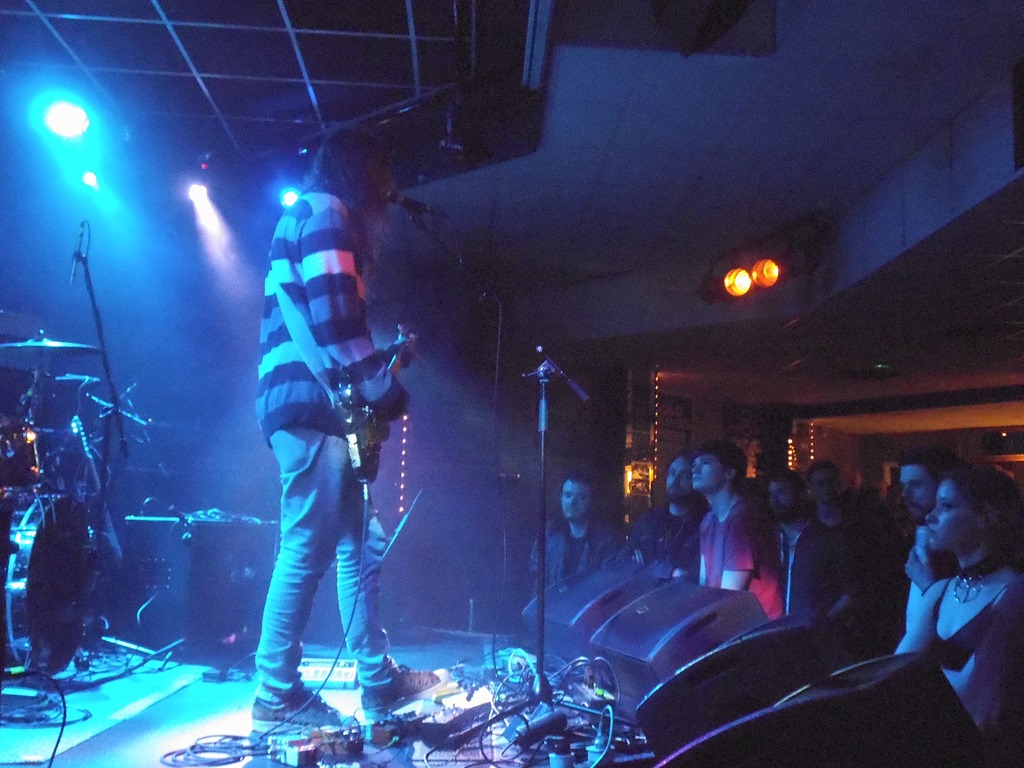 Jessica93, it transpires, is usually a band, but on this occasion is a solo artist, and a guy in a baggy wide-striped jumper and faded blue jeans with long hard and a fairly simple-looking pedal set-up, although it turns out said pedals run through three separate amps, and there’s a loop pedal in there. Geoff Laporte arrives on stage, throws down his leather jacket with zippy clatter and after some trouble with leads, he kicks the drum machine into action. He thrashes out a few guitar chords, and then swapping the guitar for bass, begins to layer things up. The songs are a grunge meets goth hybrid with a hefty shoegaze twist. The expansive, layered, guitar-driven and emotionally-wrought opuses call to mind the late, lamented and criminally underrated God Machine; elsewhere, snaking guitars, solid basslines and humping, fill-riven drum sequences are pure March Violets / Red Lorry Yellow Lorry / Sisters of Mercy. Cranes and The Cure are also worth a mention as reference points. And while a lot of loopers are hesitant, and tend to focus in vocals and simple arrangements, this performance stands out by virtue of Laporte’s first-take assuredness, and the fact he actually manages to sound like a full band – and a bloody good one at that – creating a dense, driving sound. At the end of a fantastic set, he petulantly kicks his kit tone side and walks from the stage. On balance it’s a cool finale and finish.