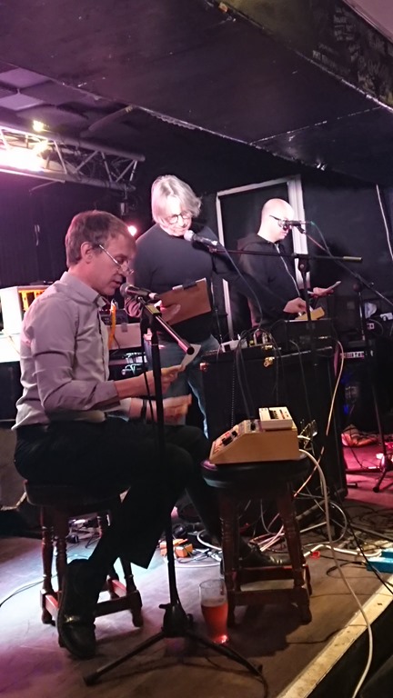 It’s the Wonkystuff House Band – a collective rather than a fixed entity, tonight comprising Tuffen alongside Ash Sagar and Simon Higginbotham – who warm things up with a set consisting of permutational repetitions delivered by multiple vocals, delivered in a drab monotone over repetitive beats. Comparisons to Can, Cabaret Voltaire circa ‘Nag Nag Nag’, The Fall, Flying Lizards, Girls vs Boys, Young Marble Giants, and the more contemporary Moderate Rebels all make their way into my notes as I watch them crank out vintage synth and drum machine sounds. Cyclical bass motifs and whizzing diodes fill the air as they sit and twiddle knobs and read lyrics from clipboards and the historical leaps into the present for a while.