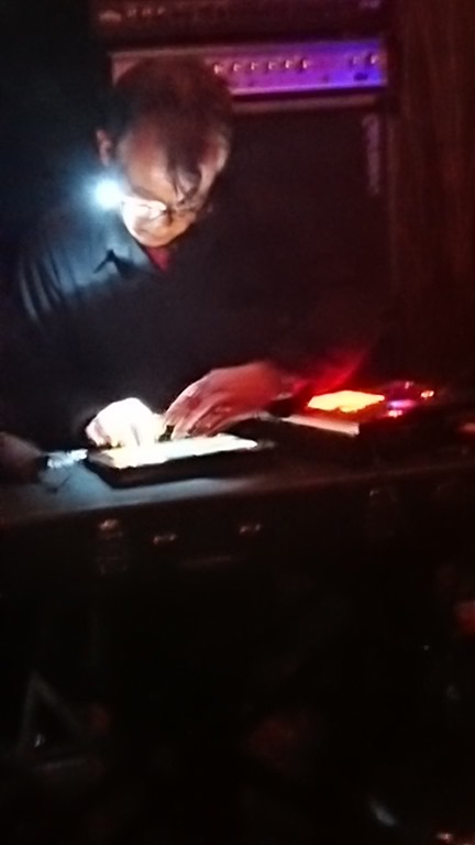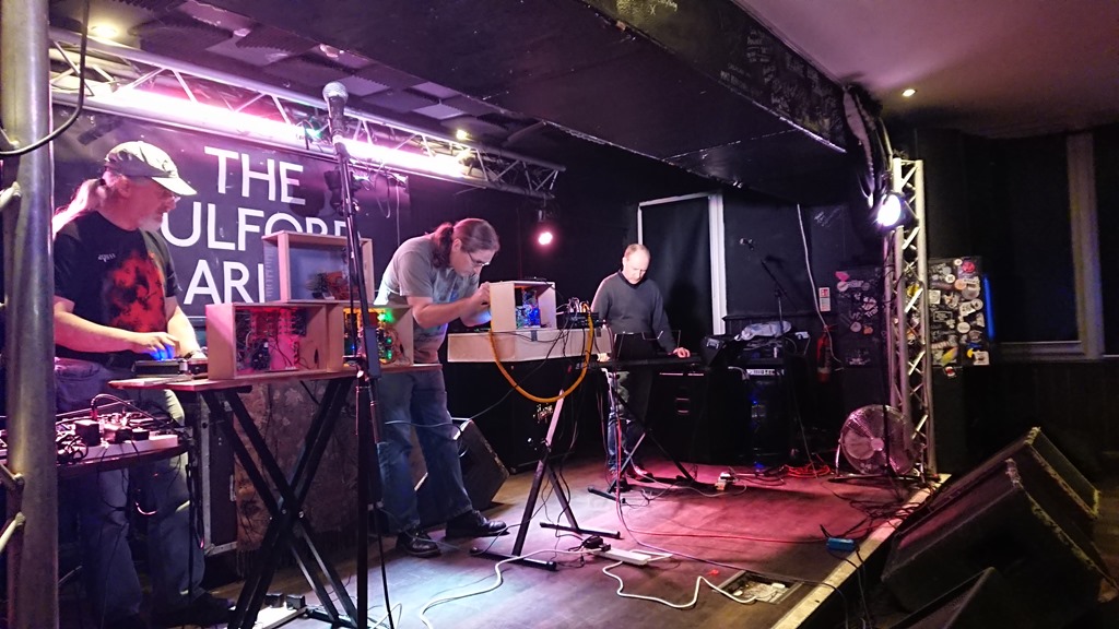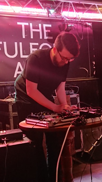 The start of TSR2’s set crackles and pops fireworks. The trio hunch over customised kit with wires all over to create warped undulations and machine gun fire beats that batter the speaker cones. The set builds into a dense, murky trudge. The second track, ‘What will be’ is more co-ordinated than the opener, and is solidly rhythmic, mechanoid and spacious, and metamorphosises into some kind of glam reimagining of Kraftwerk via DAF. Heavy echoes and tribal beats dominate the third track, and they very much find their groove at this point, at least for a spell, before the construction grows shaky despite solid foundations. Perhaps it’s the sheer ambition of layering up so much at once that’s difficult to keep together. Despite this, the discord and dissonance are part and parcel of an intriguing set.