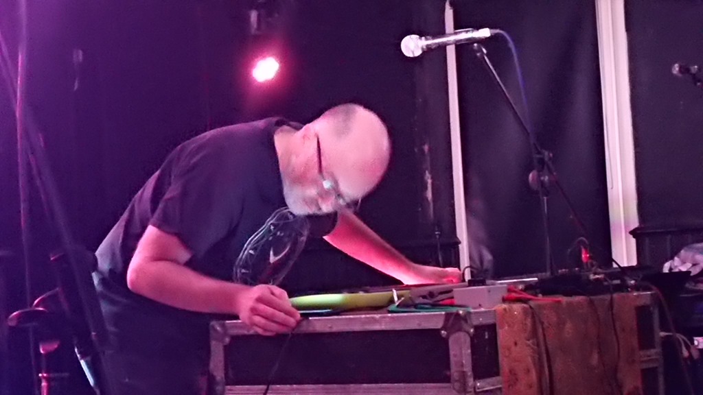 It’s a hard act to follow, but See Monstd – the new musical vehicle of radiofreemidwich’s Rob Hayler is an inspired choice, in that it represents something completely different that thus prevents any risk of comparison. There’s a lot going on here: the set starts with a sample, then breaks into what my notes describe as ‘wtf noise’. It subsequently settles into heavy harsh ambience, with dense, grating drones providing the body of sound, with swerves off trajectory for spells of audience participation, with a phone being passed around for members of the crowd to repeat lines from the sheets circulated prior to the set. This is one of those performances where you never know quite where it’s going to go, and is all the better for the element of unpredictability.