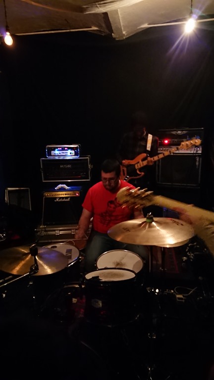 Intimate isn’t even close.: it’s about the size of my living room, although it’s still probably a few feet bigger than The Hovel in York’s South Bank Social, which has a capacity of maybe 16. The drum kit and back-line fill most of the room, after which we manage to pack in maybe 20. And the lighting is as minimal as the space, only less consistent.