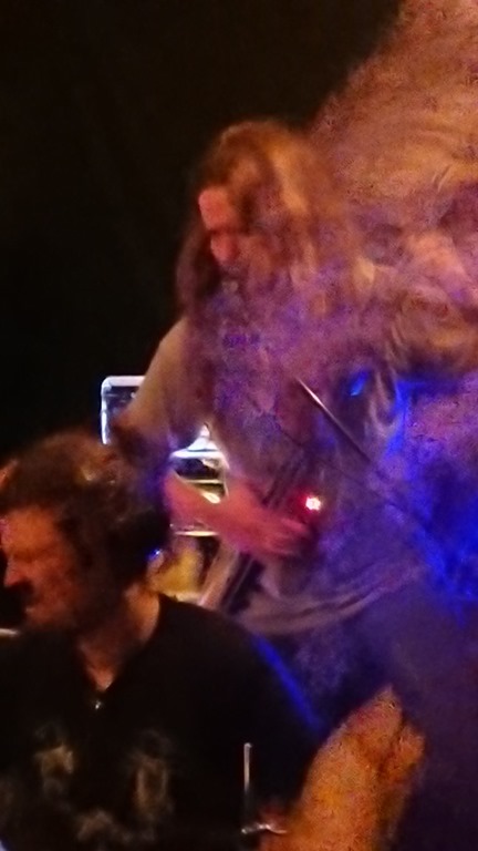 James Watts has more bands and projects than I have albums in my review pile, and having met him and performed alongside Lump Hammer in the summer, I was keen to see how things worked with a different slant and lineup, and an absence of knitted head/face garb. Whereas Lump Hammer ae sludgy and repetitive, Plague Rider mine a seam of pounding math metal, with Watts’ vocal veering between shrieking demonic and guttural taking a shit deep grunt. And what the fuck even is his two-string instrument with some kind of touchscreen attached? In the less-than—half-light, I’m struck by how much Watts resembles a young Alan Moore. It’s so dark, I can barely see the rest of the band to know what they look like, but they relentlessly kick out juggernaut riffs that hammer hard.
