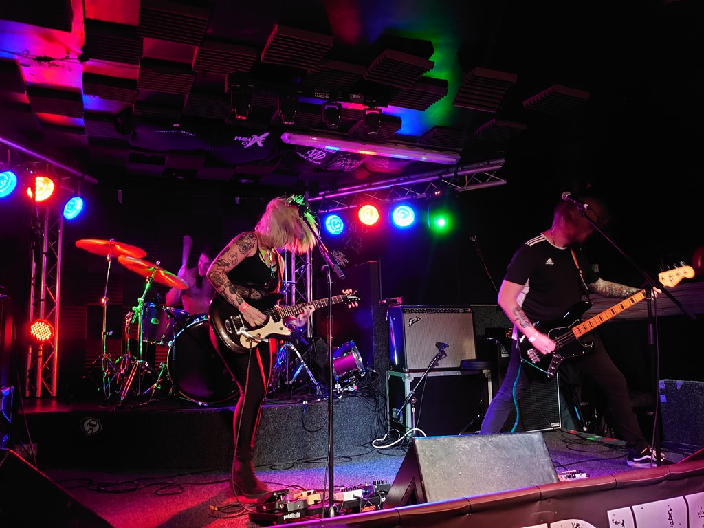Making a swift and sadly premature exit, I scoot (not literally) to dive bar Vortex for Weekend Recovery. A band who’s ever-evolving, they have a different lineup post pandemic, and tonight stripped back to trio, their sound is a lot harder, heavier and darker. Lori’s looking a bit Susie Quatro. ‘In the Mourning’ crashes in second in and drives hard. With Lori on sole guitar duties, it’s down to the dirty fat bass to fill out the sound, and it certainly does. ‘There’s a Sense’ soars and slams and nags, while ‘Yeah!?’ takes a slower, more sultry turn. The set closer and upcoming single single sees shared vocal duties with bassist and further accentuate the harder sound, and it’s a cracking close to a sweaty set.