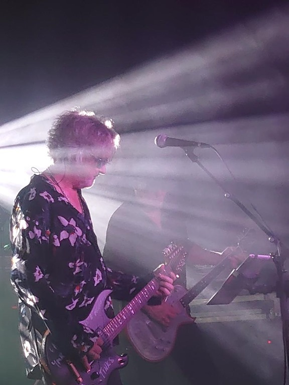In fact, the sound isn’t great, the vocals distorting at certain frequencies being a real issue, especially for anyone without earplugs. And holy fuck, is it hot. It was getting warm before the band took to the stage, as the smoke began to fill the space: that stuff seems to trap heat like a blanket, but with the aircon inexplicably switched off, two or three songs in and everyone is melting. The first set is a bit of a mixed bag of more recent material, with some unexpected gems from the deeper depths of the back catalogue, with their cover of ‘Tomorrow Never Knows’ landing early, and ‘Let Sleeping Dogs Die’, ‘And the Dance Goes on’ and ‘Into the Blue’ sparking hard-hitting nostalgia (I’d completely forgotten being on holiday in the Lake District when non-album single ‘Into the Blue’ was released and having my parents drive to Keswick where I purchased the 7”, 12” and CD and my father thinking I was absolutely nuts). I expect many of those present will each have uniquely personal memories connected to various songs, and to the band overall.