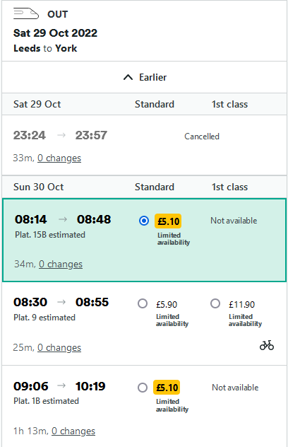 I am not happy. I was supposed to be at a gig in Sheffield this evening – a gig that had super-early doors – 18:30 – and a super—early finish (22:00). When booking the ticket for the gig, I checked the trains, and there was a 23:05 that got me home some time a little after midnight. Now, the last train home is at 21:22. I could split the journey, and make the 22:25 train to Doncaster, arriving into Doncaster at 22:49. But it only connects with the 23:50 out, which thanks to a lengthy wait in the arse-end of nowhere, takes 9 hours and 58 minutes, arriving into York at 08:48. Getting a train to Leeds is marginally, better, but not really: the sole train that goes via Leeds instead of Doncaster arrives in Leeds at 23:27, missing the 23:25 by 2 minutes, and so getting into York at, or there’s the 23:05 from Sheffield to Doncaster, which then connects to the 23:50 to Leeds, which, having missed the cancelled 23:24 means waiting for the first train out on Sunday at 08:14. No thanks.