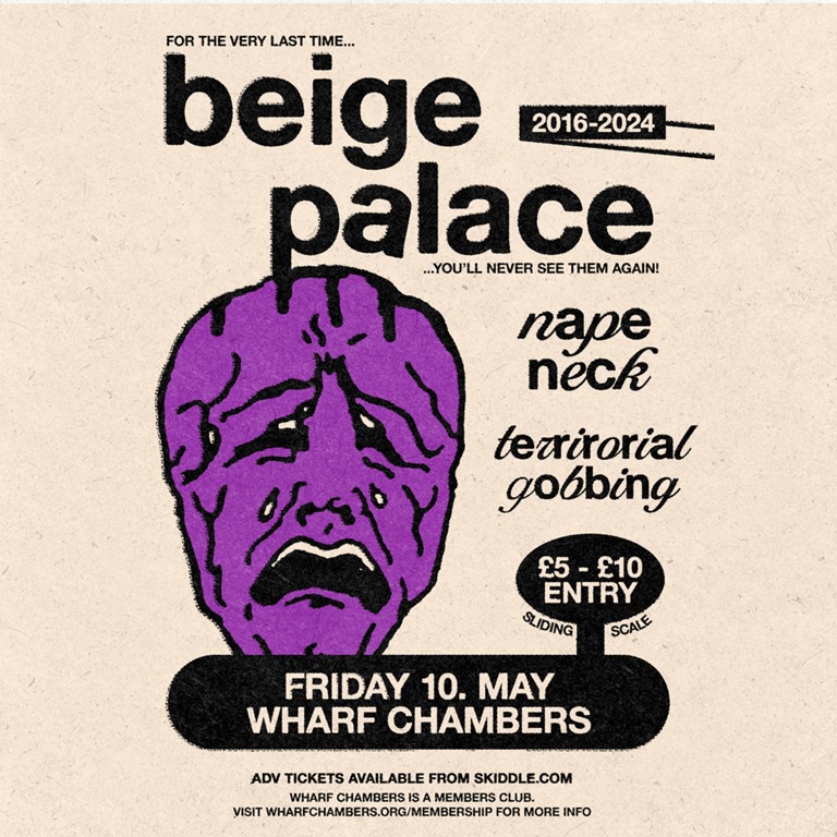 Beige Palace was a band from 2016 to 2024. During that time we released two albums, an EP, a split 7" and some other miscellaneous bits. We toured the UK a bunch, we managed to play shows in France and Belgium, and we opened for some of our favourite bands like Shellac, Mclusky and Dawn of Midi. It has been lovely!