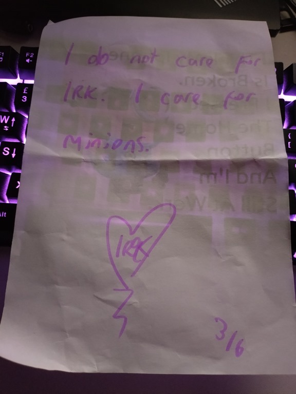 Irk’s set was punchy and abrasive, delivering fifty minutes of intensity interspersed with comedy, making for an event which felt like the perfect launch for the album. And I shall treasure my numbered, annotated minion forever.