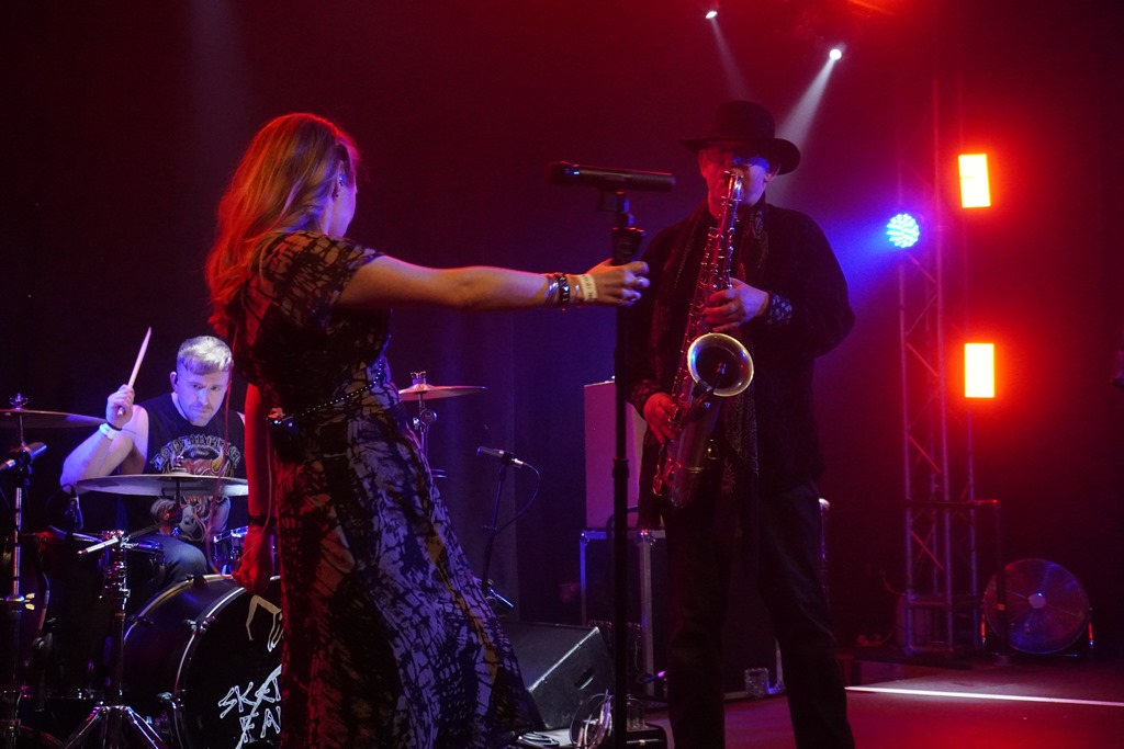 Tonight’s set draws substantially on Light From Dark, as well as featuring a new and unreleased song, which they’re planning to record in the coming months, indicating that as much as they’re a ‘heritage’ band, they’re still very much creatively active as well as keeping busy on the live circuit. And not only are they sounding fantastic, but there’s a real energy about their performance tonight. Anneka is all the energy, relentlessly bouncing, bounding, swinging and swaying about the stage, but the rest of the band are well animated, too: Ian “Karl Heinz” Taylor is particularly ambulant when switching synths for sax and adding some nice groove to the solid rhythm section, with stand-in drummer doing a superb job of delivering those quintessential rolling tribal rhythms paired tightly with Trotwood’s solid, urgent basslines. It’s all topped with Stan Greenwood’s spindly guitar lines – very much a defining feature not only of the Skeletal Family sound, but representative of that early northern goth sound. It’s clear they’re having a great time, and their collective enthusiasm is infectious.