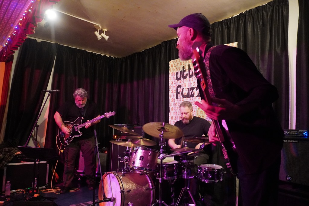The Unit Ama clearly spent some time on their soundcheck: they sound absolutely fantastic from the first note. On their last visit to York in the summer of 2024, they played a short set around the middle of a bill which also featured The Bricks and Teleost, as well as Objections and Cowtown (I clock a couple of Objections T-shirts tonight). Here, with room for a more expansive set, they seem simultaneously relaxed and energised. Their set is tight, but in disguise as something loose, improvised. It’s apparent, thought, that as much as there’s a keen intuition between the three of them, they’ve put some rehearsal time in.
