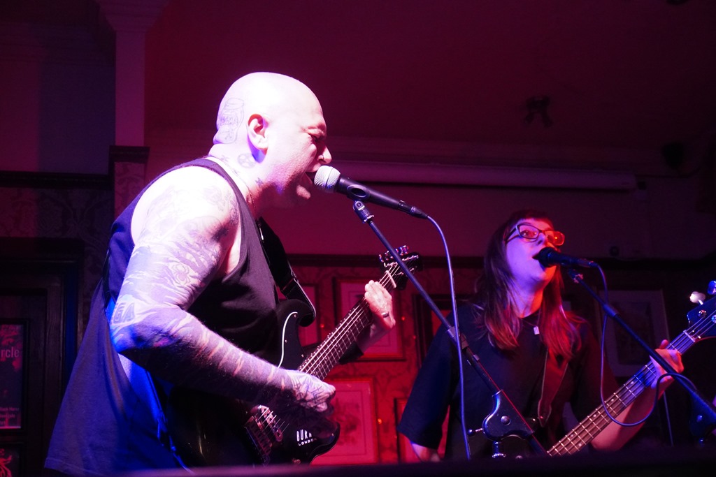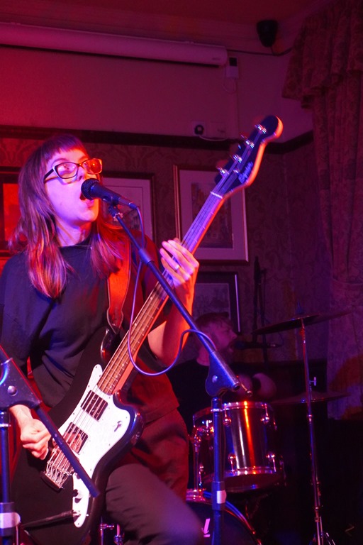 The same can’t be said of JUKU. Discussing them beforehand, I summed them up to someone as ‘loud’. “C’mon,” was the reply, “That’s not a style, or what they sound like.” Ordinarily, I’d agree, but the description on the flyer simply states ‘bring earplugs’, and I pity anyone who didn’t. This band is nothing short of a rabid riff monster. They play big, dumb riffs, reminiscent at times of The Stooges, The Ramones… with everything cranked up to eleven… They play hard and fast and with a frothing intensity. Naomi sings and whacks her bass and spends the set willing her glasses to stay on her face to the end of each song. They have a few issues with feedback from the mics tonight, which have likely been turned up to compete with the blistering volume of the backline. But if the result is chaos, it’s utterly compelling and immensely powerful. Brittle surf-goth lead guitar lines echo through the squalling wall of noise, and it’s wild to see a band of this calibre – and of this volume – for free in a York pub with a capacity of maybe seventy-five, when they’re worthy of headlining at The Brudenell in Leeds.