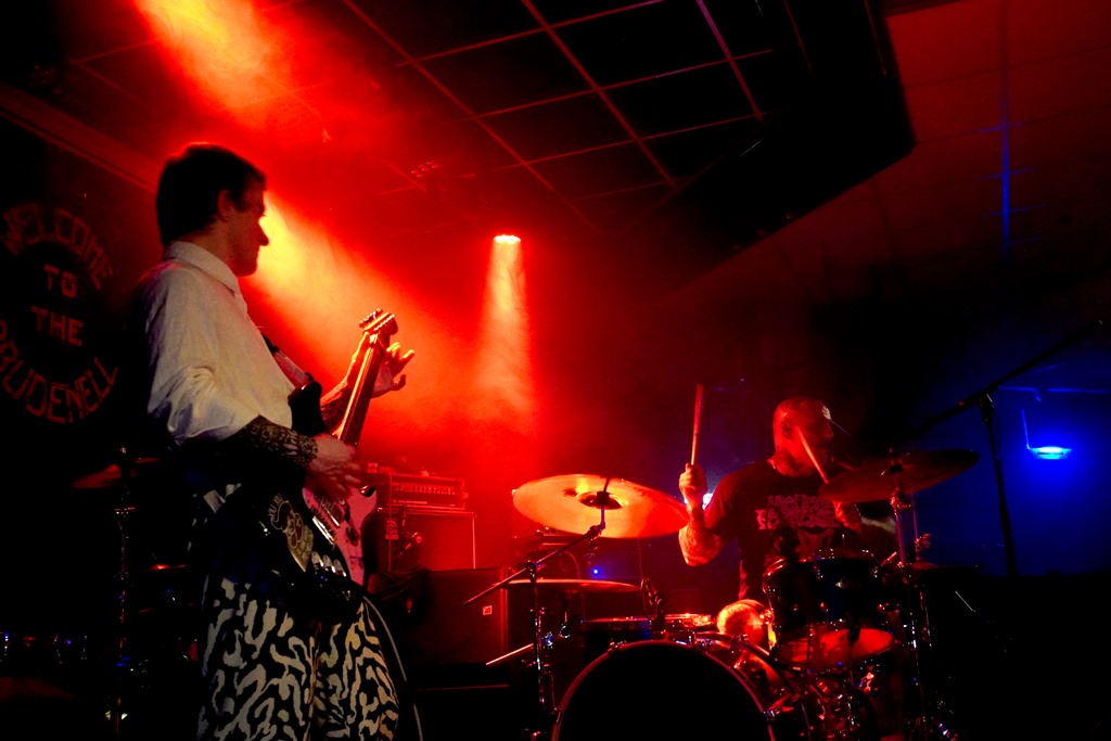 Is it possible to go to a gig in Leeds with local acts from the noisier end of the spectrum on the bill without Steve Myles being in (at least) one of them? The evidence suggests that it is, but it’s rare. Tonight, it’s grindcore power-violence duo Pleb, with Myles drumming and growling who are first up. They fill the space between songs – while Steve gets his breath and adjusts his kit and wanders around seeking to locate nuts which have flown free of their cymbals – with squalling noise and feedback. With the guitar split between two amps and what appears to be some contact mics running straight to the mix desk, the noise is not only phenomenal for a two-piece, but the noise they make is utterly filthy, and they’re great fun.