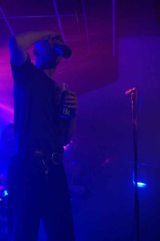 The Shits live is almost two acts sharing a stage: the three guitarists, bassist, and drummer drive away at a simple repetitive riff for four or five minutes, with their heads down, keeping it tight and focused, while the singer comes on like a cross between David Yow and Johnny Rotten, sneering, snarling, swilling and spilling beer over himself and the crowd, and generally playing up the part of confrontational front man, goading the audience and being antagonistic. There’s a lot of punk performance going on here: charging into the crowd and nabbing their drinks, tossing empty and not-quite-empty cans and pint post into the audience, who in turn lob them back while charging back and forth in front of the stage in some kind of slam-dance / gumbys / silly walks mayhem. Some of it’s mere posturing, to be sure, more mock dangerous than actually dangerous, and nothing about their performance is remotely sophisticated, but in terms of straight up entertainment, they bring it.