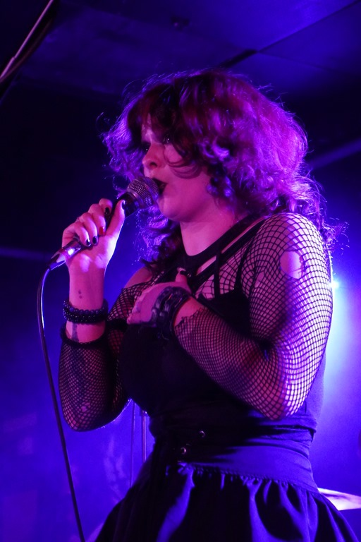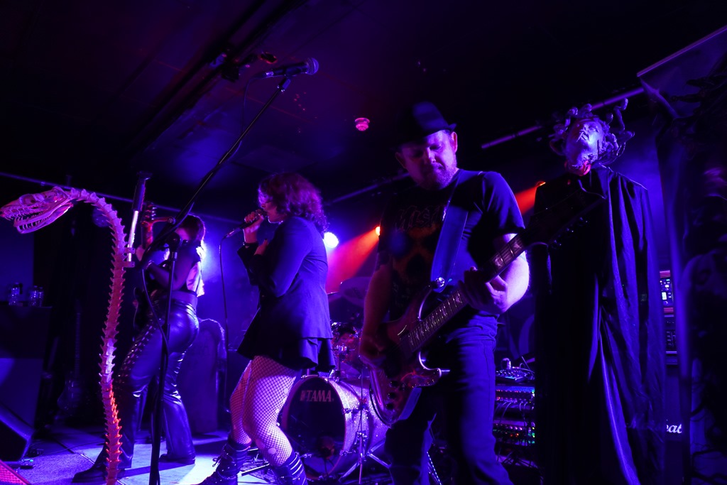 Lesbian Bed Death win for attention-grabbing name. They go all out on the stage set, too, with banners, mannequins, and a mic stand that’s composed of a strange animal skull atop a curved spine. In contrast with Diamond Black – and The Birthday Massacre – they’re darker, heavier, more metal, and they bring a more theatrical and punk style to the night. The name is a strong one, and works with a collective of predominantly female musicians… but it wasn’t always thus, and the band’s mastermind is the stumpy bearded guy in a Misfits T, and with a hat and a beer belly who goes by the name of Mr Peach. For reasons I’m unable to fully articulate, I’m always suspicious of men with beards trimmed so neatly at the neck. And having whipped out ‘the coolest’ guitar for the last song, it sounds like ass, and he switches back to his other guitar after just a few bars. But, objectively, with a set bursting with churning, slicing riffs, and gutsy, full-lunged vocals, their performance is solid quality and great entertainment.