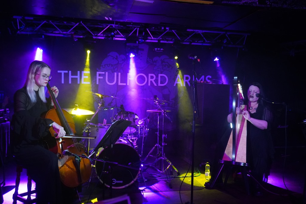 Eldermother – consisting of Clare de Lune on harp and vocals and Michalina Rudawska on cello – have no shortage of musical pedigree, and a superabundance of talent which they showcase with their minimal neoclassical works, a mix of covers and original material. They open with Radiohead’s ‘Street Spirit (Fade Out)’ led by harp and with Clare’s soaring vocals, and it’s one of those performances that make the hair stand up on back of your neck with its haunting atmosphere. There’s a rendition of WB Yeats’ poem ‘The Stolen Child’, a work rich with imagery inspired by wild nature and imbued with emotion and drama. The execution is magnificent, and the originals are similarly graceful and majestic. ‘Hurt’ may not be by any stretch representative of Trent Reznor’s career, but it certainly showcases his capacity for powerfully emotive songwriting, and if it’s the song which forms his legacy, it’s all to the good. Yes, Eldermother play a semi-operatic version of ‘Hurt’ with harp and dark, brooding cello, and… woah. It’s almost too much, especially this early in the evening. I find myself dabbing a tear and grateful for the low lighting.