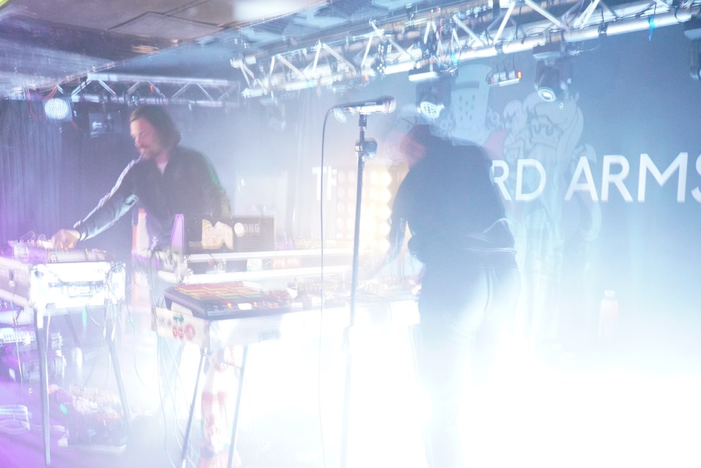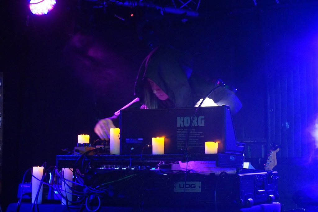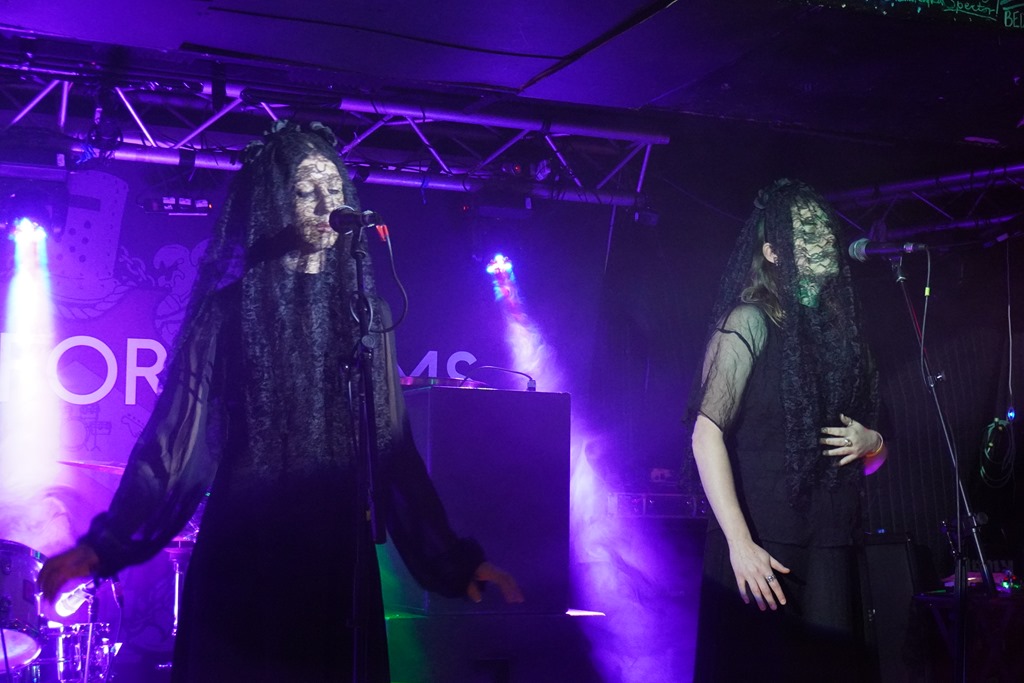 Lunar Cult Club – featuring Doug Gordon, aka Futures We Lost – as the provider of the instrumental machinations, take the theatricality up several notches to deliver a set of otherworldly cold, cold, darkest electro with glacial synths and funereal forms. The bank of synths swirl and grind, muddy beats thud and pop from amidst a dense sonic fog. Sonically, they’re impressive – in the main, the arrangements are sparse, and overtly analogue in form – but visually, they’re something else. Theirs is a highly theatrical stage show, and this significantly heightens the impact of the songs. The two singers, dressed all in black and with faces obscured by long, black lace veils – Corpse Bride chic, as my notes say – sway and move their arms in an unnerving fashion, as if reanimated, exhumed. I’m reminded of Zola Jesus and of Ladytron, and I’m mesmerised by their facsimile of a Pet Sematary Human League with its spellbinding marionette choreography. The final song, ‘No-Ones Here to Save Her’ is as dark as it gets: the vocals merge and take us to another realm entirely.