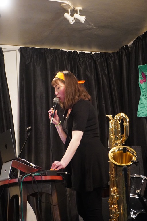 Kar Pouzi proved to be an absolute revelation – at least to me. Anyone who is a regular reader will know where I’m coming from here, and I felt a buzz of excitement from early on in her unashamedly strange and arty set. Switching between baritone saxophone and unusual microphone technique, Helen Papaioannou offers a performance that’s captivating – for me – and perplexing for many. Her setup involved laptop and pedals, with undulating oscillators and drum machines accompanying her unconventional approach to music-making. There’s a lot of breath and discord here, and – at times – some blasting noise. Kar Pouzi sits on the fringes of jazz, with the saxophone and vocals channelled through various processors and loops resulting in music that belongs to the early, evolutionary stages of industrial as represented by Cabaret Voltaire and some of Throbbing Gristle’s work.