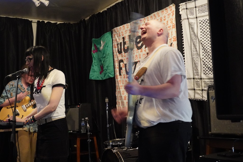 Headliners Fashion Tips aren’t from York, but they’re pretty fucking special, as my coverage of their releases and their last York appearance supporting Thank in April last year attests. They’re presenting a different lineup here, and are stripped back to a three-piece. And tonight’s headlining set is barely half an hour in duration, but it’s a brain-frying frenzy of explosive electronica and instruments that sound plain wrong at times – by which I mean the bass sounds like brain-whizzing scribbling synth overloading with treble on minute before switching to gut-blasting low-end the next while the guitar delivers both shards of trebly distortion and weirdy noises more commonly associated with analogue synths. The chaotic, cacophonous racket is all driven by the most frenetic, spasmodic blasts of drum machine. The band positively crackle with energy, and look like they’re having a blast as they pack the songs so tight there’s absolutely no time to catch a breath. The effect is a short, sharp shock, and makes for a dizzying climax to a stacked lineup – and all in a good cause, too. Free Palestine!