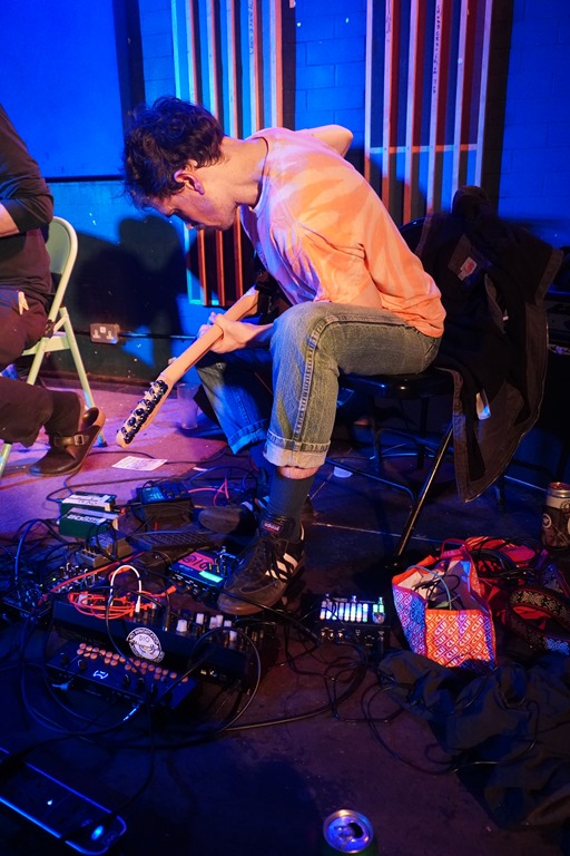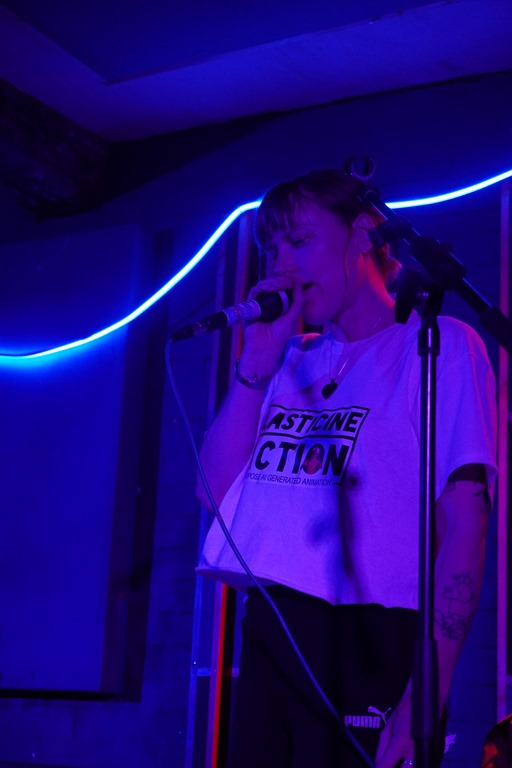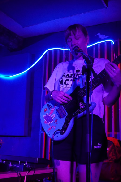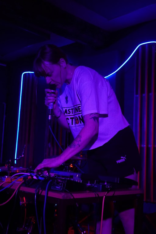 Thankfully, normality – of the kind we’re here for – resumed with the arrival of Sour Faced Lil, the solo project of Hilary from Cowtown. Her set starts – somewhat incongruously – with a quirky electropop cover of Bright Eyes. I just about manage not to cry. Then she swerves into swooshing space rock noise galore, and she explores the weird and wibbly, and it’s everything you’d expect from a Heinous Whining night. Live drums, looped, live guitar, and warped, undulating synths create a cacophony of sound in layers. The performance is a little tentative in places, but the audience is behind her all the way. There’s something quite enthralling about seeing a solo artist juggling myriad musical elements and instruments, knowing what a balancing act, how much effort it is to remember everything and keep the flow, and the fact she manages it is impressive.