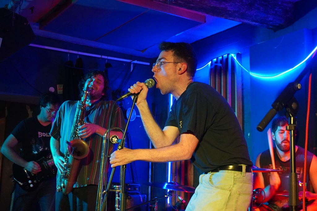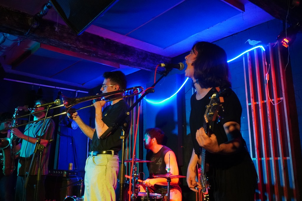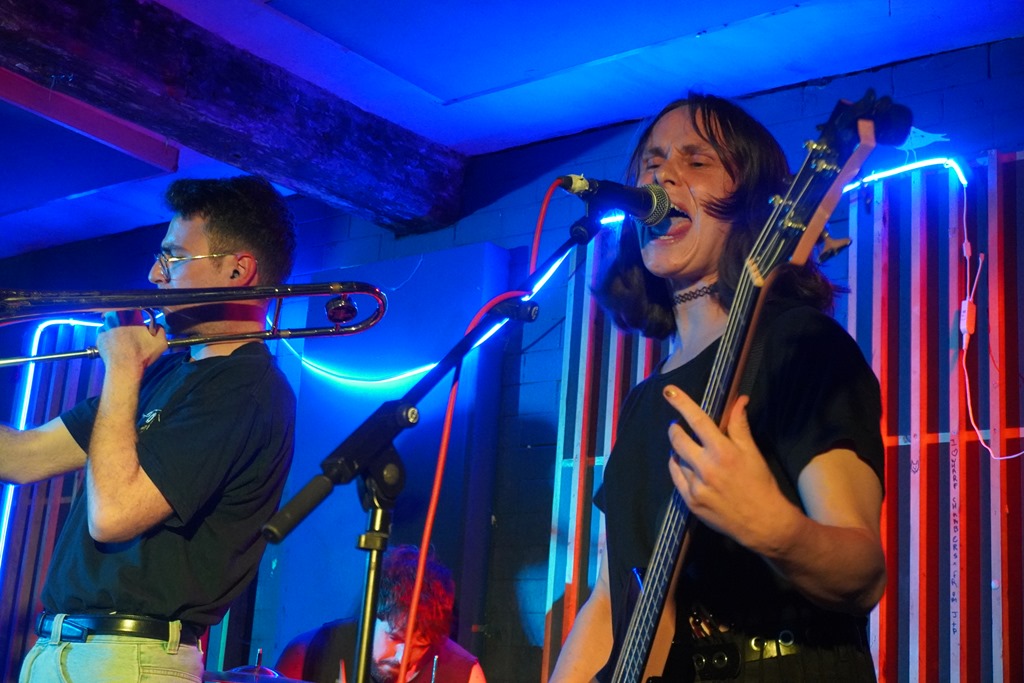 It takes me a while to get into Borgia, and my initial impression is of these purveyors of jazz punk is ‘jazz punk cunts in suits’ (which, I know, is a niche piece of self-referencing for the ten people familiar with my own ‘musical’ work, but, why not?). They’re decidedly more jazz than punk, and the shades are off after five minutes. But they present a pretty meaty racket with busy bass balanced by sturdy drumming and some wild parping sax. The theatrical enunciation and dramatic presentation is a bit over the top and only nearly as cool as they think, but all credit to them for putting on a performance. They’re seriously tight and go all-out to entertain.