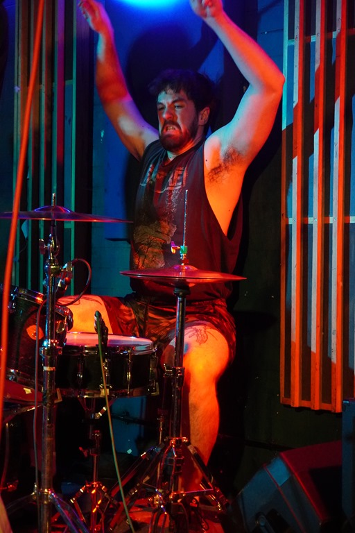 Ferguson’s drum kit isn’t only the focal point: it occupies the majority of the little stage, with Fred Schreck (bass and vocals) and Pauly Williams (guitar) positioned either side. It’s perhaps as well they’re not given to ambulating a great deal. In Williams, they’ve found a guitarist with a sound that’s incredibly close to that of the late, great, Geordie Walker, and capable of churning out methodical riffs – and his dense, compression-heavy sheet metal thunder really rings out in a live setting, more so than recorded. He keeps his head down and just keep cracking ‘em out, and it works well alongside sturdy bass grooves, while it’s the busy, full-kit drumming that provides much of the action, the movement, within the songs.