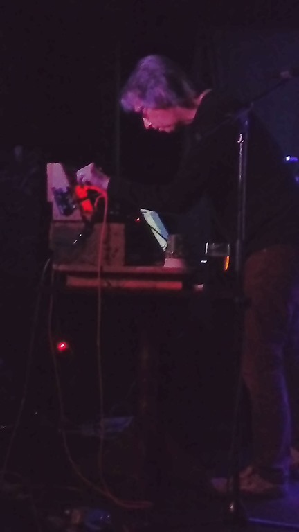 How Buildings Fail – the musical vehicle of Simon Hickinbotham – brings a different kind of odd, and one that’s much more song-orientated. The array of DIY and customised kit packed onto a small table includes an inverted Pot Noodle carton (chicken and mushroom) which appears to contain a set of controls. The material’s centred around the grainy and the granular, analoguey synthy sounds are modulated into gloopy oscillations and swerving sine waves which collide with overdriven, clattering drum tracks. Hickinbotham rattles off rants about philosophy and reading comics. It’s a weird, nerdy clash that lands somewhere in the field next to The Fall, Meat Beat Manifesto and Revolting Cocks. ‘Creative supply is outstripping demand!’ he calls by way of a refrain in the final song of the set. He’s right, but those gathered tonight are appreciate of their demands being catered for.