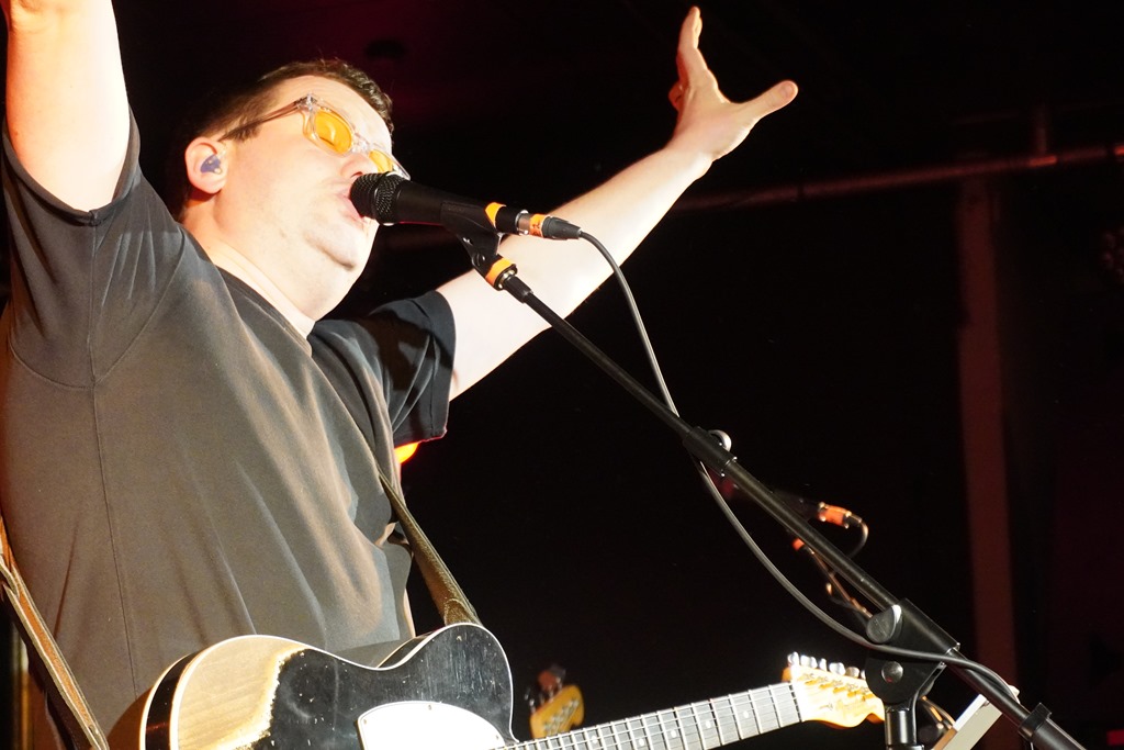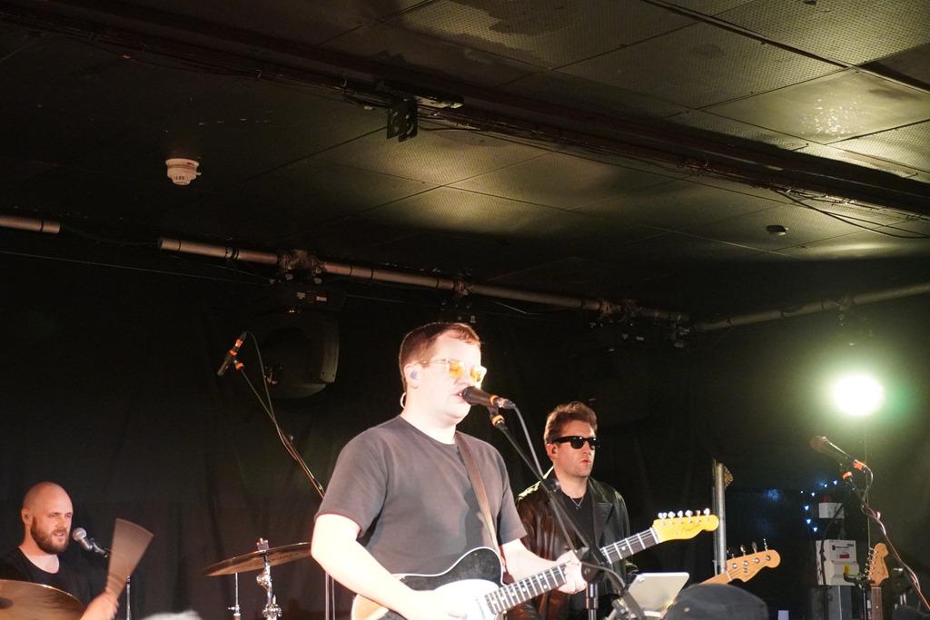 There has been no shortage of bands doing precisely this since around 2004, but Superlative drumming elevates their Editors /Interpol / White Lies – etc. – sound. The vocals are a flat, monotone and slightly twangy baritone with all the reverb, which take me a while to place, but they land somewhere between I Like Trains and She Wants Revenge. Credit to the sound guy, too, who’s working hard with the reverb and echo, especially on new song ‘Echo’, which has ‘instant classic’ written all over it and goes down a storm. They’re tight as and the sound is outstanding, with some super-solid bass at the pulsating heart of it all – and unlike Oliver Marson, leather jacketed bassist Andy Keating keeps his shades on – although I can’t help but wonder if they’re prescription and he’s doing a Wayne Hussey.