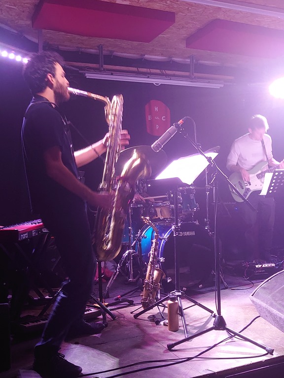 Leeds trio Slozbo Kollektiv are first up, and they serve up a set of the kind of clean, crisp, technical noodling that never really seems to get going or take form. or find a groove… Initially, I’m struck that the drumming is as tight as fuck and the way he handles his sticks is something worth watching. He uses an array of broken cymbals to create a whole host of far-out percussive effects, laying one atop the snare to create a different kind of clatter… But then how tight is the playing when there are no rhythms to speak of, only rattles and bursts of percussion? The set is defined by so much discord and busyness… I find my thoughts becoming as fractured as the compositions. There are, it would seem, extremely tight structures here, but they’re chaotic, esoteric, and non-linear…. Playing two guitars and a horn simultaneously… How many notes can they fit into a bar? Vocals seem fairly redundant, and I come to thinking that they sound like shit musicians pretending to be good ones by playing as many notes as fast as possible and not knowing when to stop. It made for the longest 40 minutes ever.