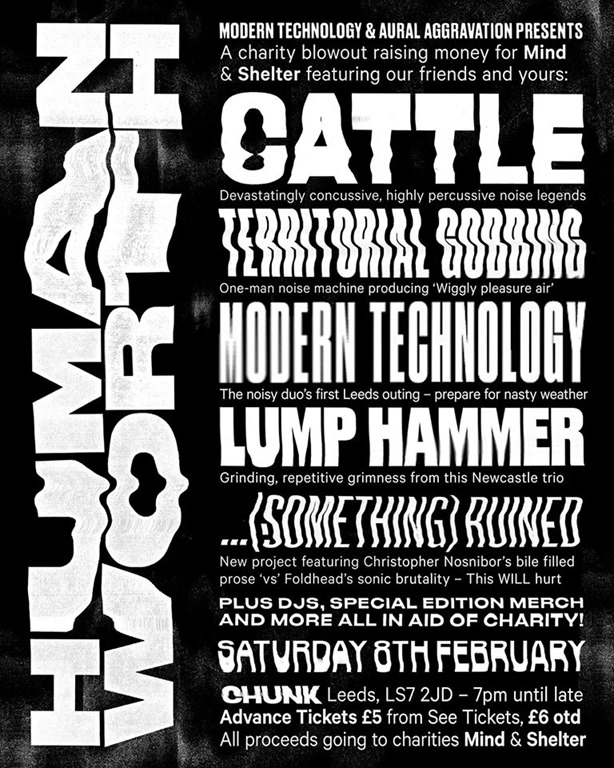 We’ve been bigging up Modern Technology since the release of their eponymous EP – not just because it’s powerful musically and lyrically, but because the duo believe in trying to make a difference in a bleak world. And so we’re inordinately proud to be involved in the latest Human Worth charity fundraiser, which sees proceeds donated to Mind and Shelter, and which sees their first Leeds show in 9th February 2020. It’s headlined by percussion-heavy racketeers Cattle, and they’re joined by one of Newcastle’s heftiest, sludgiest bands in the form of Lump Hammer, Leeds’ finest maker of manic electronic noise, Territorial Gobbing, and relative newcomers, …(something) ruined, a brutal power electronics duo consisting of Paul Tone (Foldhead, Inverted Nepal) and one Christopher Nosnibor.