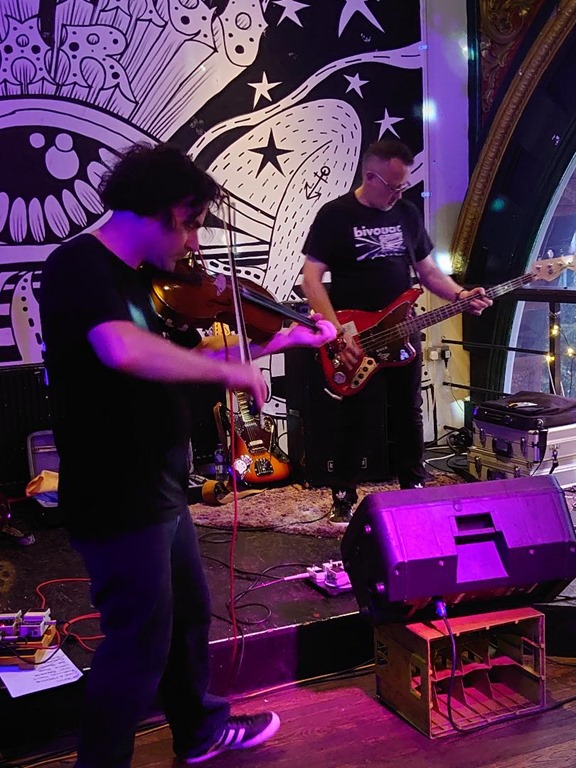 Mills switches to violin for new song ‘White Rose’, a raging industrial stomper, and some guy looking like uncle fester sits on the sofa and starts clapping like a seal for the second half of the set, while mopping his bald head frequently with a handkerchief and waving to some of the oldies on the other side of the room. The closer is a squalling epic where Mills again switches to violin – played through his guitar FX units to build a screaming climactic wall of noise. It’s blistering, and elating to see – and hear – that after all this time, they’ve not lost the fire.
