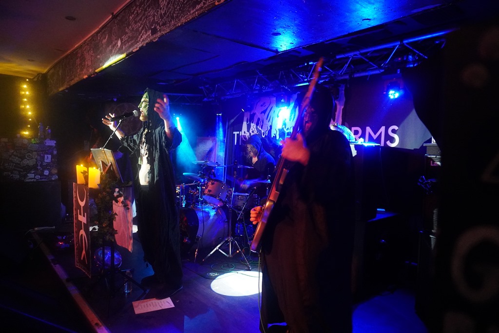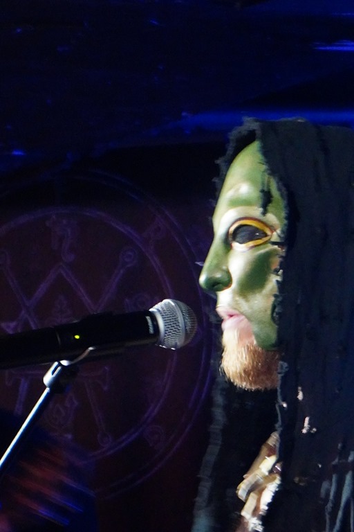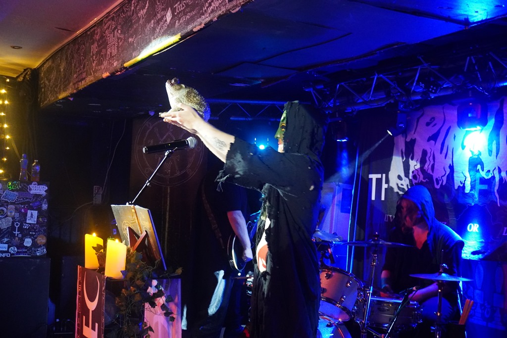 The more preposterous the concept, the more committed you have to be, and Froglord prove that they’re one hundred per cent committed (or that they perhaps ought to be), with a stage set which has all the props, from a stage backdrop to a lectern on which stands a copy of some esoteric bible, via masks, cloaks, and a giant plastic frog. The set is structured around a swamp ceremony, and there’s no breaking character – apart from when plugging merch, which is done in character while acknowledging it’s a break in character, which offers some postmodern reflexivity, and in the way front man Benjamin ‘Froglord’ Oak will adopt the stance of a high priest before getting down and grooving to the monster riffs, cloak flapping, mask slipping. It’s funny because they clearly know it’s daft but play it with straight faces. That kind of dedication is impressive – as is their shit-your-pants bass sound.