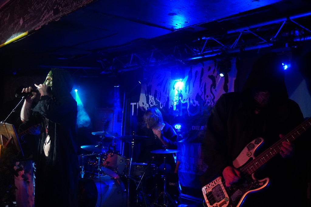 With a wardrobe which included kilts and masks and aprons and chef hats, Chefs Kiss weren’t all that comedic – or at least that funny – a comedy act, nor especially musically accomplished either. Does the world need a joke thrash act? Actually, it probably does, and fair play to them, in that they didn’t take themselves seriously, and largely adhered to their rather daft concept, and were good fun, bringing out a life-size cardboard cut-out of Ainsley Harriot which was passed around the venue above the heads of the audience like some sort of crowd surfing cardboard deity. What’s more, they looked we enjoying themselves, and every young band has to start somewhere. This is once again why we need venues like this.