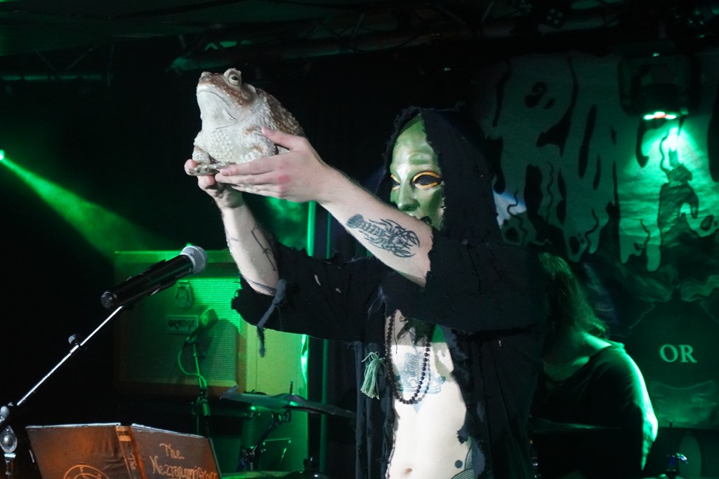 If you’re going to pursue a concept – particularly one that’s ridiculous – you really have to go all-in to pull it off. Oh, and Froglord do. The Bristol band’s five – yes, five – albums to date, including the most recent, Metamorphosis, released just a couple of weeks ago, are all preoccupied with expanding the lore of The Frog Lord, centred around the Book of the Amphibian, with swamp rituals and The Wizard Gonk and the like. Behind all this stupidity, there are some fierce riffs, and a fantastically solid doom metal band. I would have been perfectly happy if they turned up in jeans and T-shirts and blasted out the raging riffs. I might even have found it easier to connect with. But this is about performance, theatre. It’s also about doing something different. There is certainly no shortage of serious doom bands. There are considerably fewer doom bands who have devoted their entire careers to a concept as absurd as this.