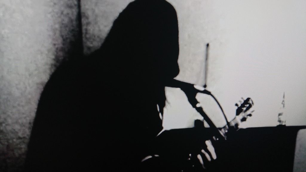 It’s disorientating watching the back of a performer’s head as they play and seeing them again on the PC monitor before them, with the whole scene framed by leaves and soundtracked by birdsong and incidental rumblings. But this is what we get from Garden Magik, whose set evolves gradually into a digital storm. At some point in the gale-force distortion, I realise my mind isn’t entirely on the set, but then, in a live setting, I would have likely enjoyed the sonic experience but found my mind wandering to maters of work and other stuff – and that’s no criticism. Under lockdown, in my office, it’s even easier to become distracted by text messages and FaceBook.