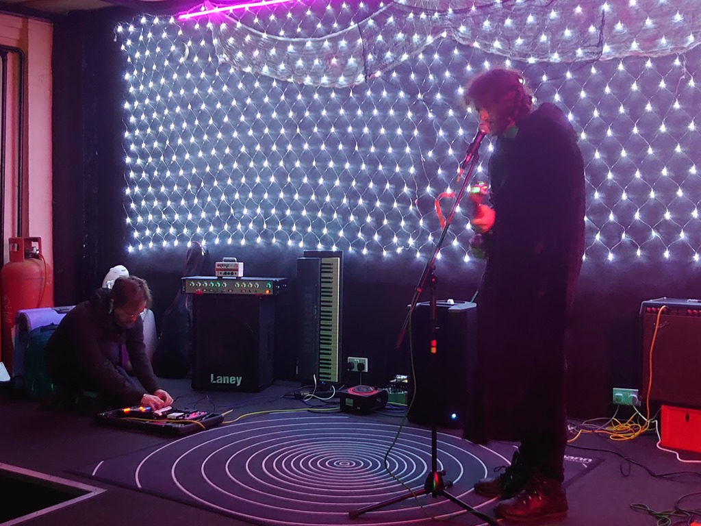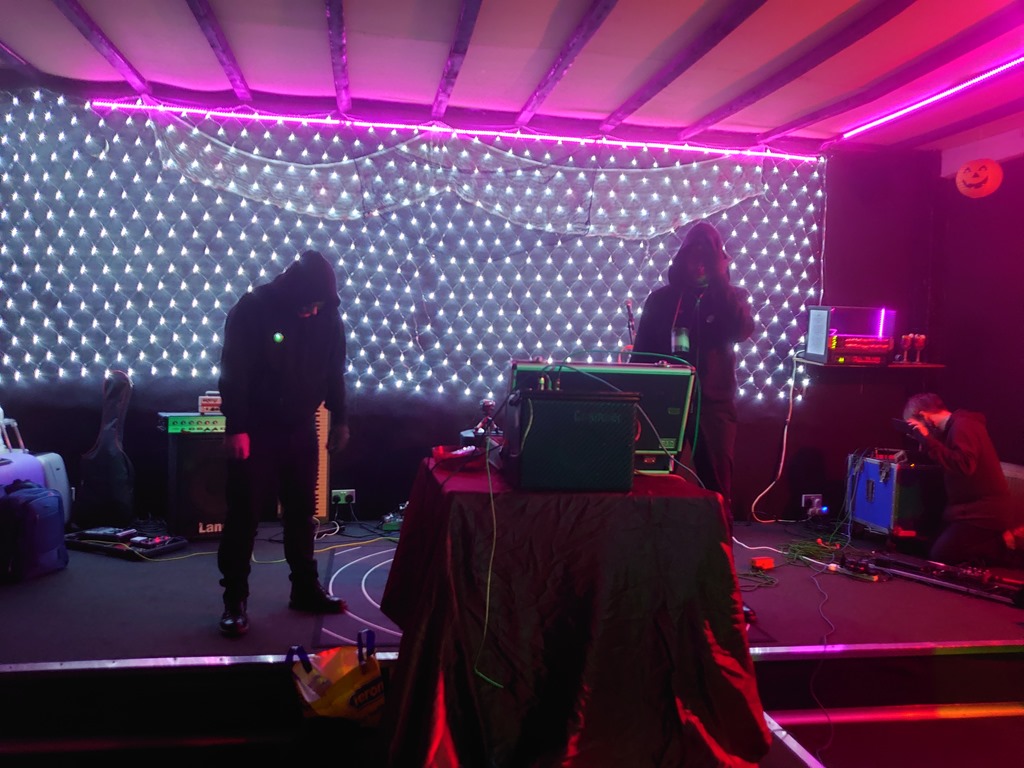For a place a bit off the beaten track, it’s stunning. Scratch that: by any standards, it’s stunning. A rehearsal space with a stage and meticulously maintained, it’s something else. The PA speakers are halfway down the room in the main room and face the stage, doubling as monitors, meaning the band get to hear the ‘out front’ mix instead of the monitor mix. There is a second, smaller room, but we’re in the main room tonight for a lineup of noise and experimentalism, and if the audience isn’t huge, at least they’re receptive.