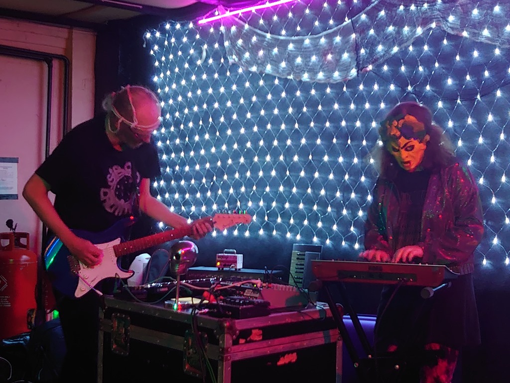 Garbage Pail Kids is an experimental duo which features Theo Gowans, aka Territorial Gobbing – meaning that anyone familiar with the scene will have an idea what to expect –namely anything as long as its experimental, noisy, and improvised – and Basic Switches, the experimental side project of Leeds indie act Cowtown. Weirdy drones and feedback strongly reminiscent of Throbbing Gristle dominate the set. There’s echoed vocal oddness and endless pulsations with phasers set to warp and stun. Crazy headgear is of course a signature, and the headgear is particularly crazy here. The ‘anything goes’ oddity is nonstop, and at one point we find Theo playing keyboard barefoot while ululating wildly. It’s a complete headfuck, but a brilliant one.