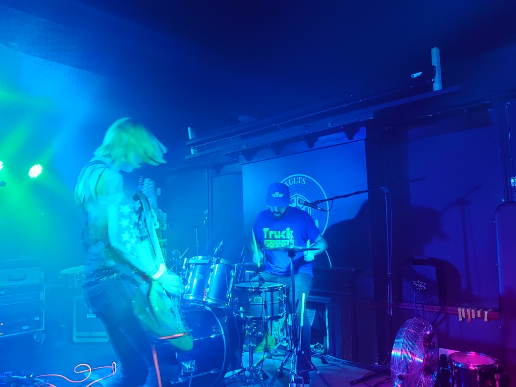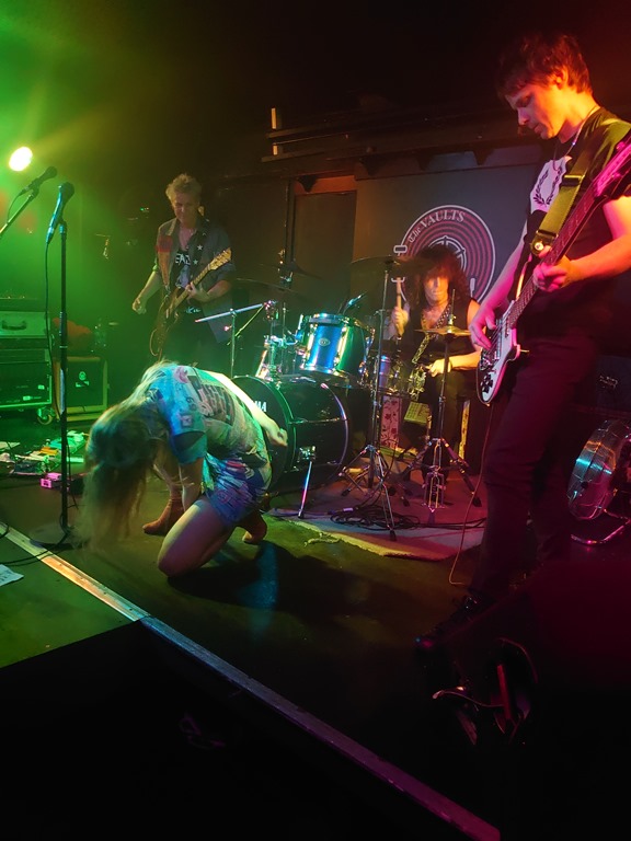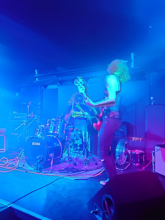 With a revolving running order, the stage times on the door simply list bands 1-4, and the first is on early, just fifteen minutes after doors. It’s Tokyo Taboo up first after some last-minute pole prep. Their act and image has come on a fair way since I last saw them way back in 2018, and their set now features unreleased material and singles released since 6th Street Psychosis. For the most part it’s chunky, spunky, punk rock with a pop edge. ‘Pussy Power’, dedicated to the women of the bands on tour is strong and empowering. The second half of ‘Self Sabotage’ is sung from back by the bar after Dolly totters through the crowd on heels that are practically stilts. As it began, so it ends, and they’re back to low-slung stoner riffage for closer ‘No Pleasure Only Pain’.